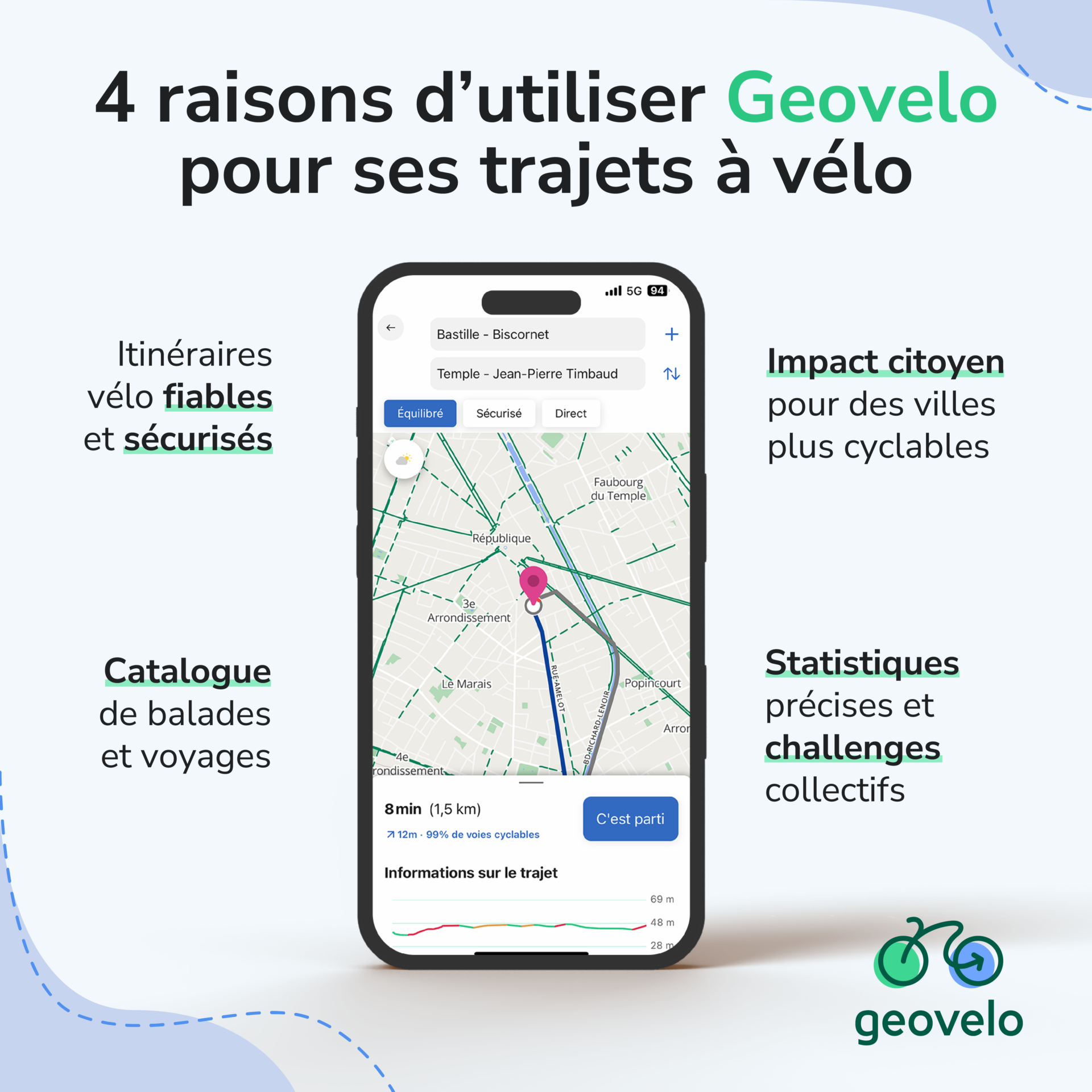 Calculez des itinéraires adaptés à votre pratique du vélo : du parcours le plus rapide au plus sécurisé. L’application choisit en priorité les pistes, les bandes cyclables et les rues peu passantes pour vous assurer confort, sécurité et tranquillité.